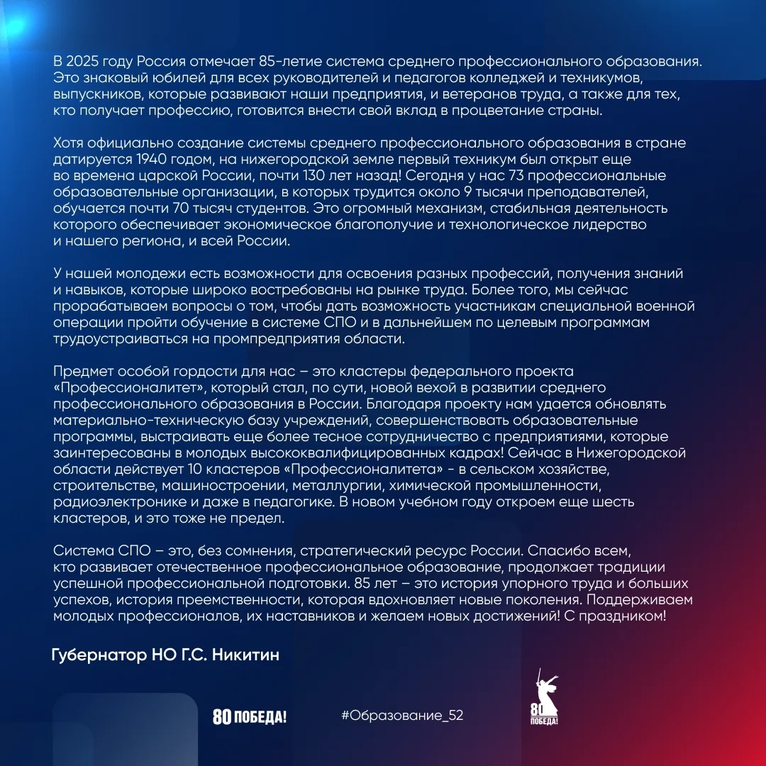 Поздравление Губернатора Нижегородской области Глеба Сергеевича Никитина с 85-летием системы среднего профессионального образования.