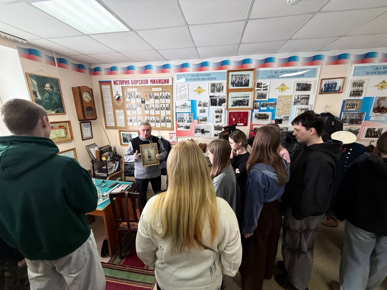 Директор Музея подполковник милиции в отставке Владимир Бекетов вызвал особый интерес у студентов захватывающим рассказом об истории Борской полиции, необычных преступлениях и людях. Так же руководитель Музея рассказал ребятам про настоящие уголовные дела 90-х годов, как сотрудники Борской милиции боролись с преступными группировками того времени. С большим интересом обучающиеся рассмотрели множество экспонатов представленных в музее Отдела МВД России по г. Бор.